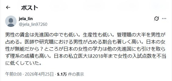 | … | 3無念Nameとしあき26/04/26(日)00:25:43No.1403420763+ 1777130743965.jpg-(51198 B) 男性の賃金は先進国の中でも低い。生産性も低い。管理職の大半を男性が占める。医師や研究職における男性が占める割合も著しく高い。日本の女性が無能だから?ところが日本の女性の学力は他の先進国にも引けを取らず理系の成績も高い。日本の私立医大は2018年まで女性の入試点数を不当に低くしていた。 |