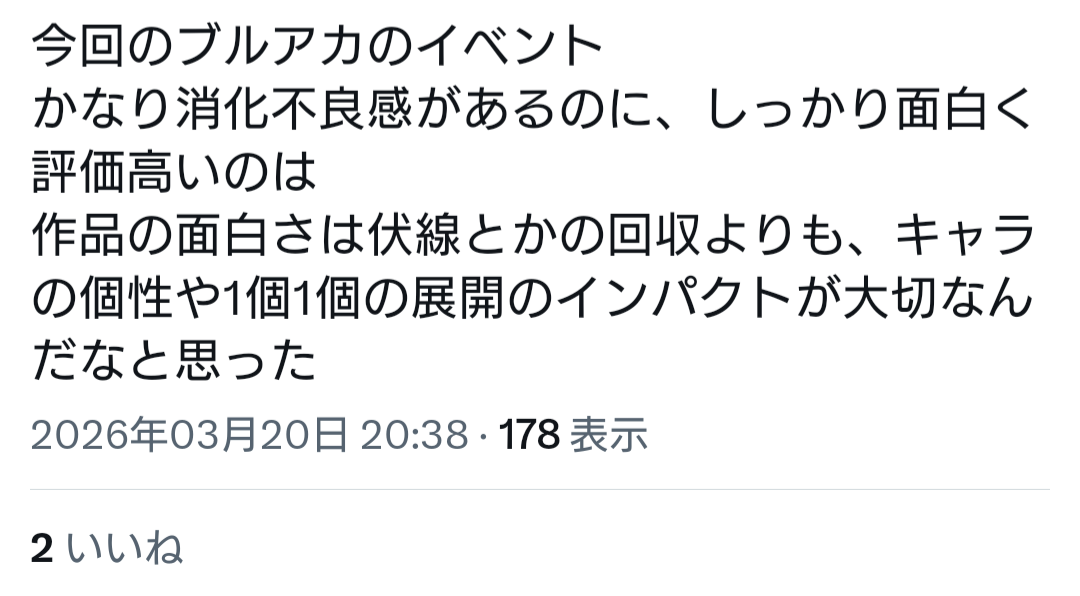 | … | 12無念Nameとしあき26/04/26(日)08:19:57No.1403456537そうだねx3ブルアカの考察してる人ってもう存在しないピースでパズル組んでるじゃんね |