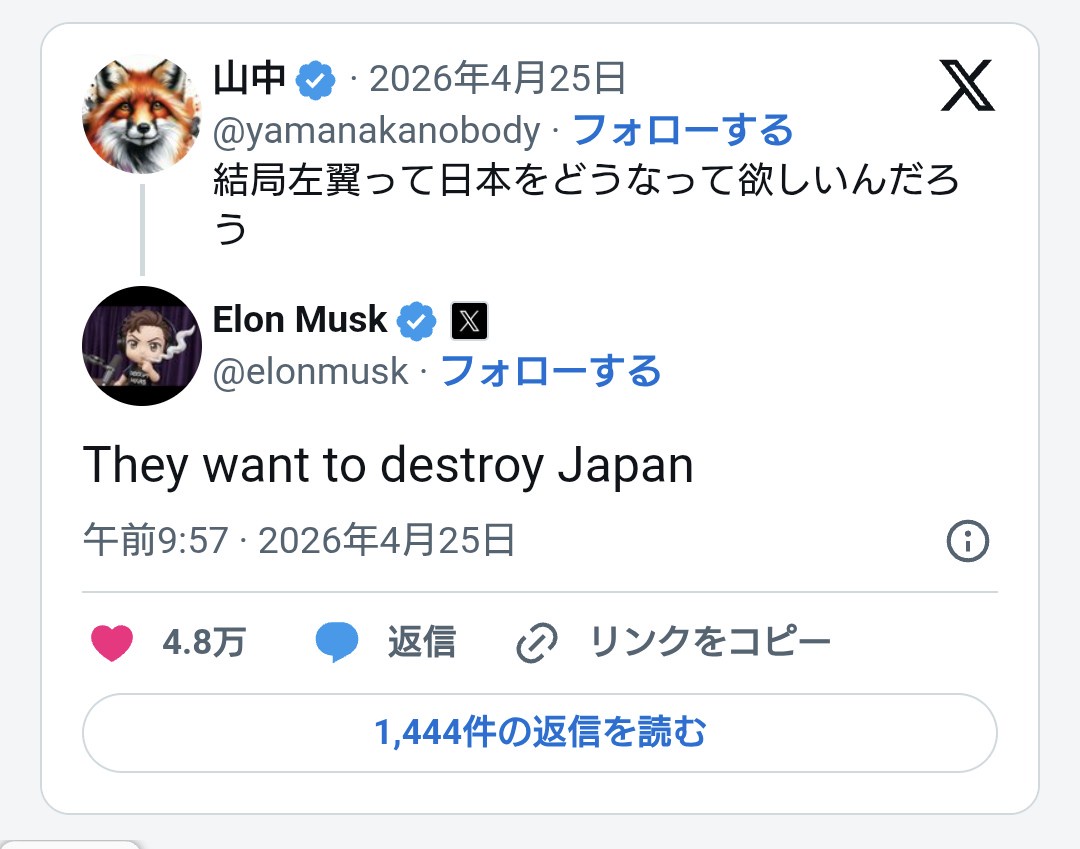 | … | 97無念Nameとしあき26/04/26(日)10:12:46No.1403479589+ 1777165966481.jpg-(128419 B) >イーロン・マスク「(パヨクは)日本を破壊したいのさ」と回答し大バズリしてしまう |