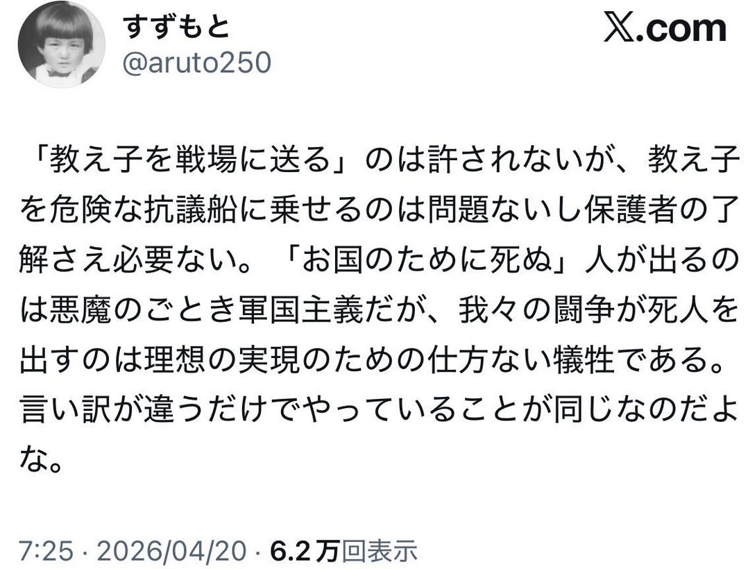 | … | 21無念Nameとしあき26/04/26(日)09:34:04No.1403471238そうだねx4ママだの戦争止めるだの言ってたけど蓋を開けたら権力で子供を危険な場所に送り込んで死なせるのは左翼の方だったというね |