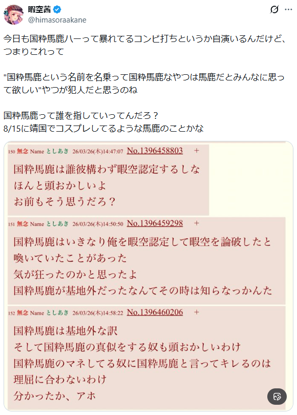 | … | 107無念Nameとしあき26/04/27(月)12:10:10No.1403742318+>>国粋馬鹿連呼してる奴が暇空から名指しでキチガイ扱いされてるの笑うよな |