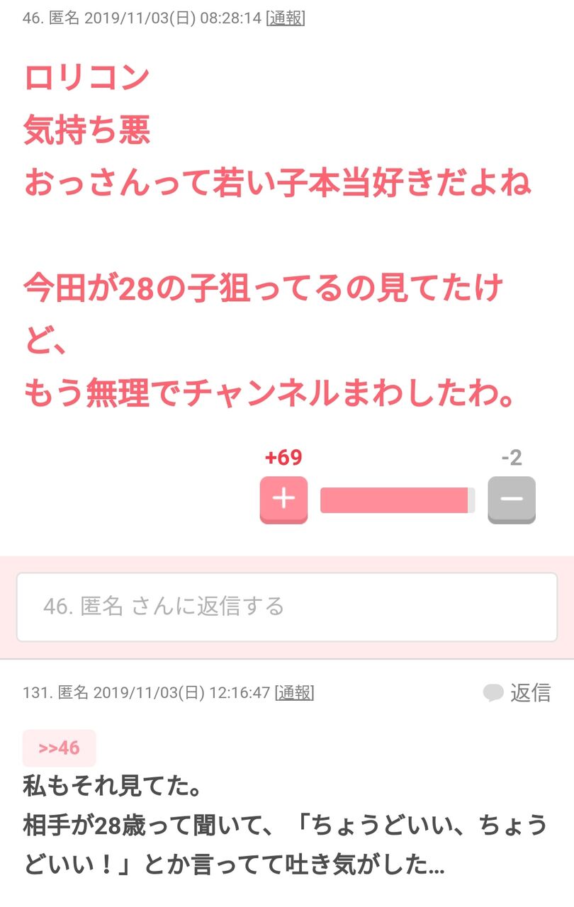 | … | 59無念Nameとしあき26/04/27(月)18:08:44No.1403798223そうだねx1>また女叩きスレがコピペに潰されたのん… |