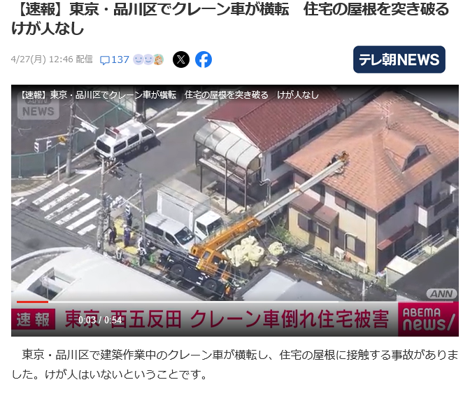| … | 106無念Nameとしあき26/04/27(月)19:55:47No.1403821774+昔は海外の現場ではクレーンは倒れるものと思っておけと言われてたけど日本も変わらんようになったな |