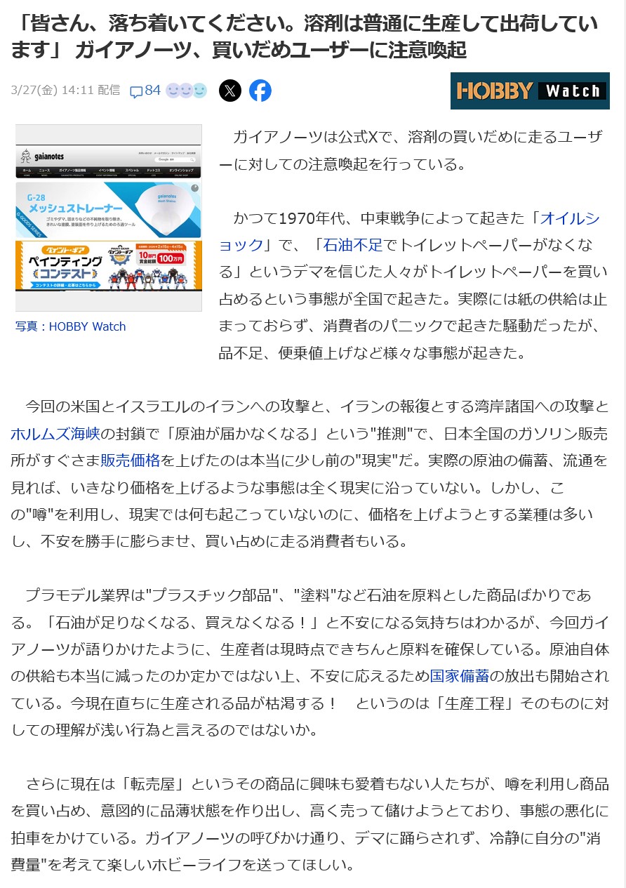 | … | 75無念Nameとしあき26/04/27(月)19:28:54No.1403814834+>先日、模型店を覗いたら「溶剤系品薄につき模型と同時購入願う」との張り紙が |