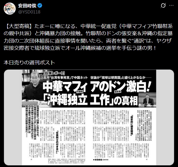 | … | 45無念Nameとしあき26/04/28(火)04:16:57No.1403906651そうだねx1 1777317417774.jpg-(156127 B) たまーに噂になる、中華統一促進党(中華マフィア竹聯幇系の親中共派)と沖縄暴力団の接触。竹聯幇のドンの張安楽&沖縄の指定暴力団の二次団体組長に直接事情を聞いたら、両者を繋ぐ"通訳"は、ヤクザ密接交際者で琉球独立派でオール沖縄候補の選挙を手伝う謎の男! |