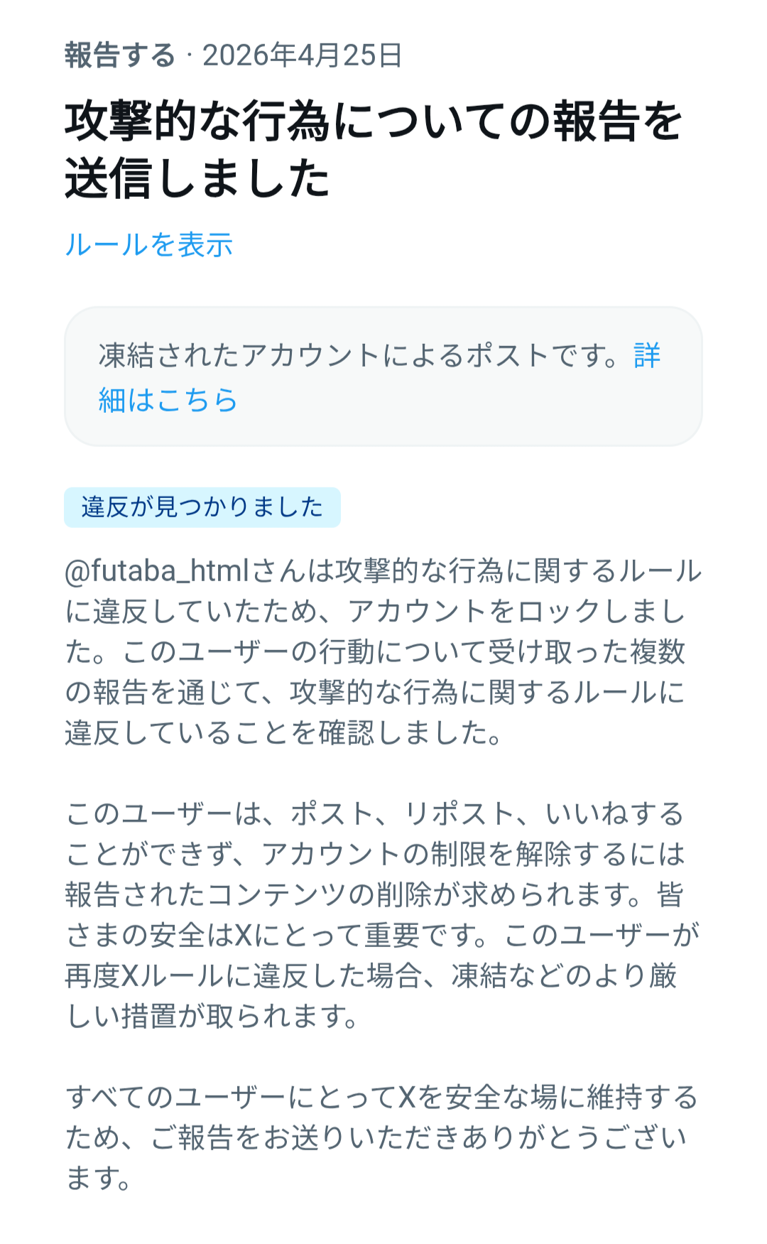 | … | 71無念Nameとしあき26/04/28(火)05:07:07No.1403908062そうだねx7ちなみに凍結されたやつがまたアカウント作るのは規約違反でアウト |
