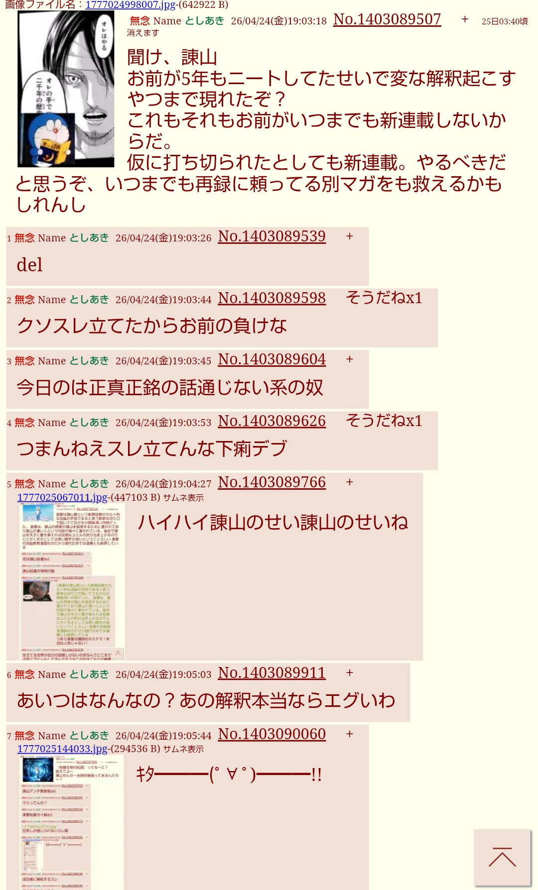 | … | 3無念Nameとしあき26/04/28(火)06:47:29No.1403911862そうだねx2おは諌山粘着del |
