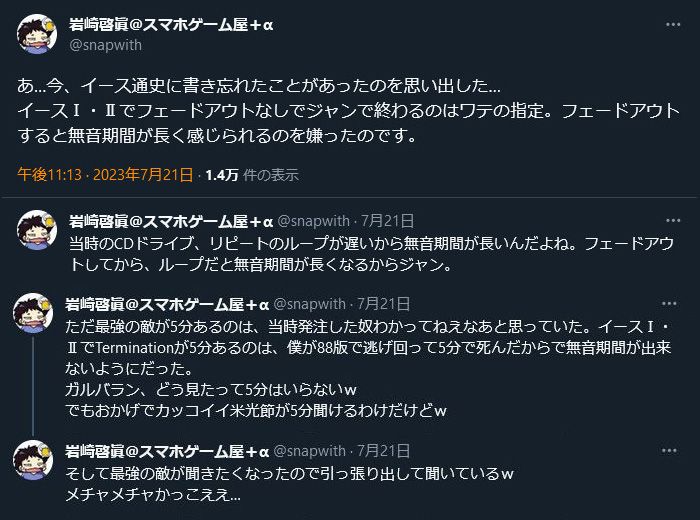 | … | 163無念Nameとしあき26/04/28(火)09:53:29No.1403929236+>岩崎啓眞がイースの移植の際にCD音源のBGMのフェードアウト無くしてた理由 |