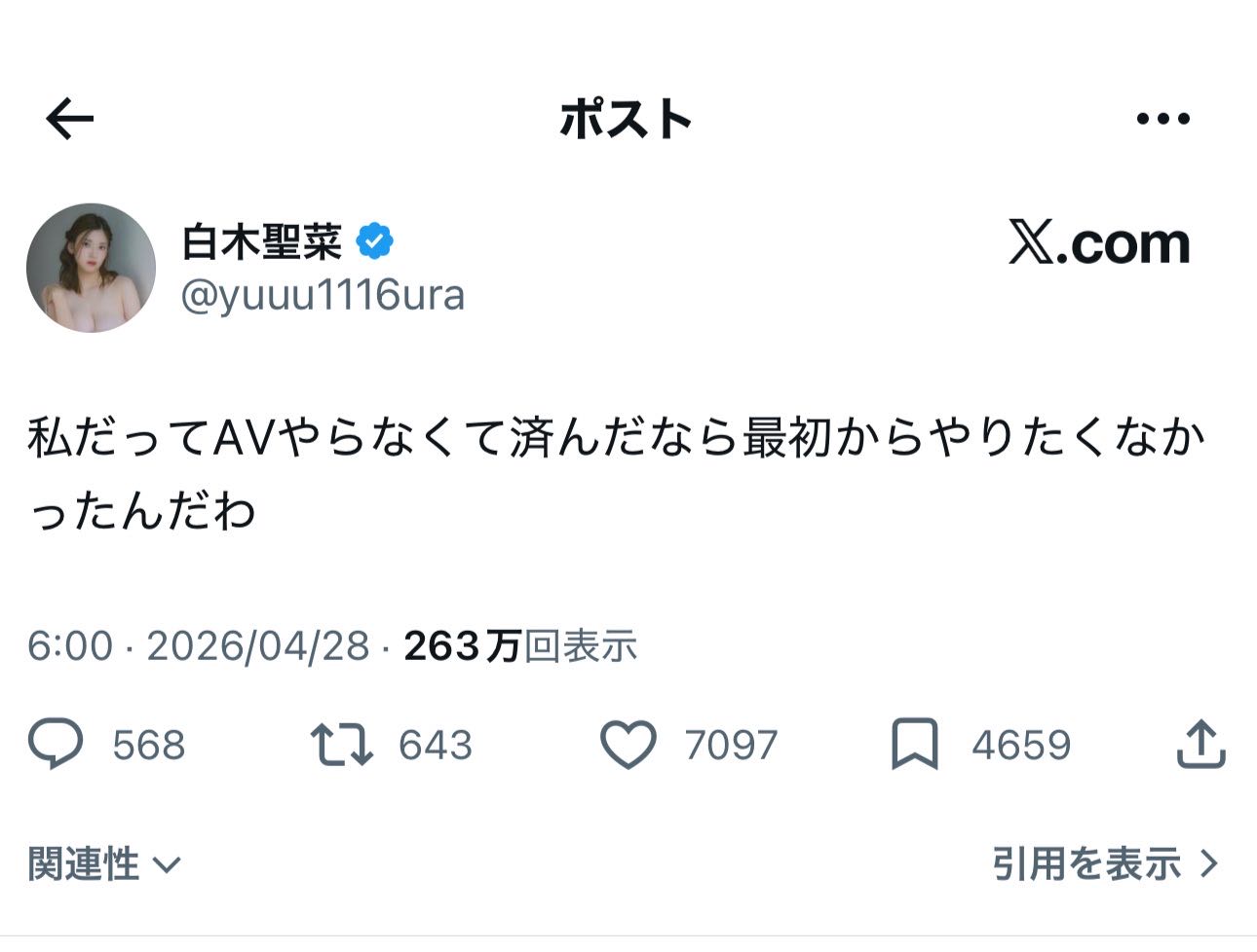 | … | 33無念Nameとしあき26/04/28(火)14:30:50No.1403969798+>やりたくてAVやってるやつの方が希少だろう |