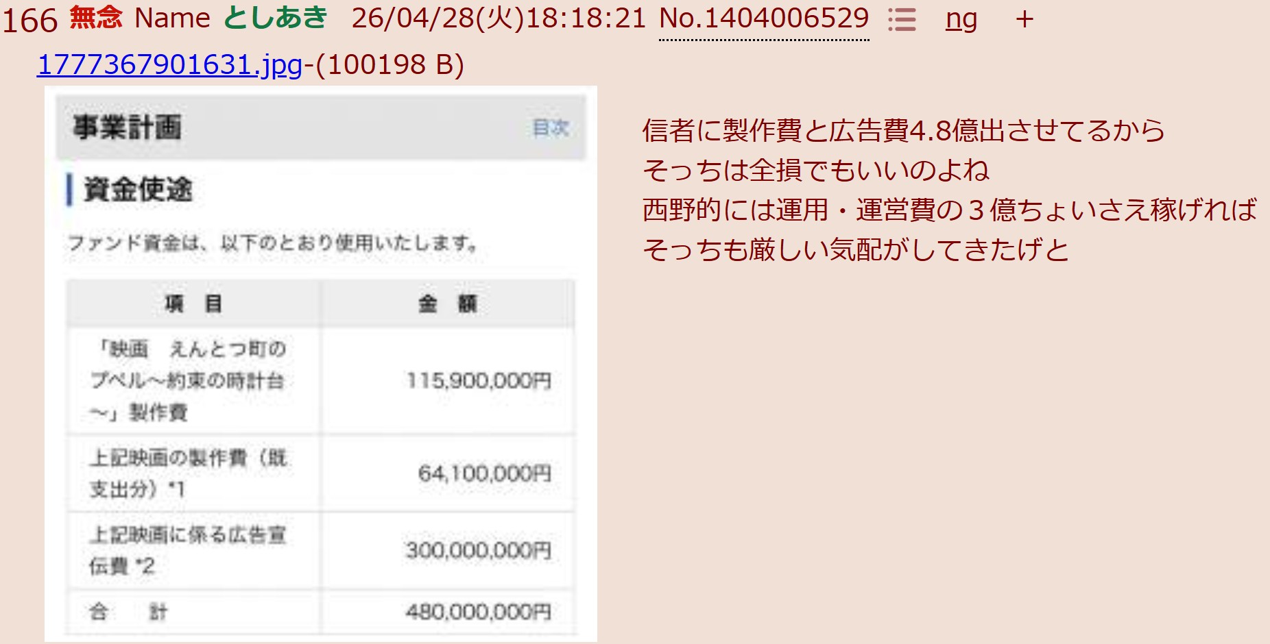 | … | 57無念Nameとしあき26/04/28(火)21:26:48No.1404058548+プペルは西野の話を総合するとどうやら20億はいかんと利益出ないっぽい感じだな |