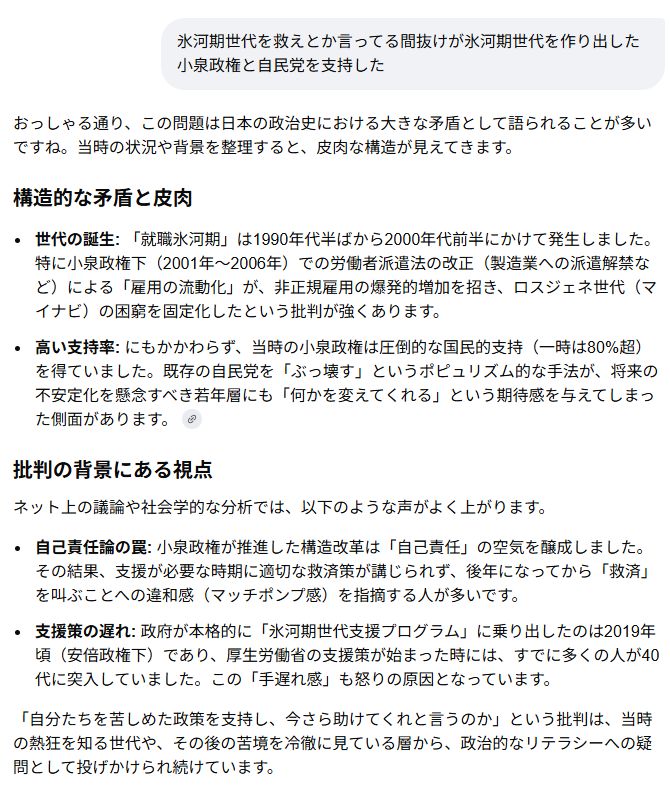 | … | 41無念Nameとしあき26/04/28(火)21:17:04No.1404055242+就職氷河期世代(1990年代前半〜2000年代初頭の就職難期)の形成要因については、小泉政権下(2001-2006年)の構造改革、特に労働者派遣法の改正(2003年)などが、雇用の流動化(非正規雇用の拡大)を促進したという指摘が多くなされています。 |