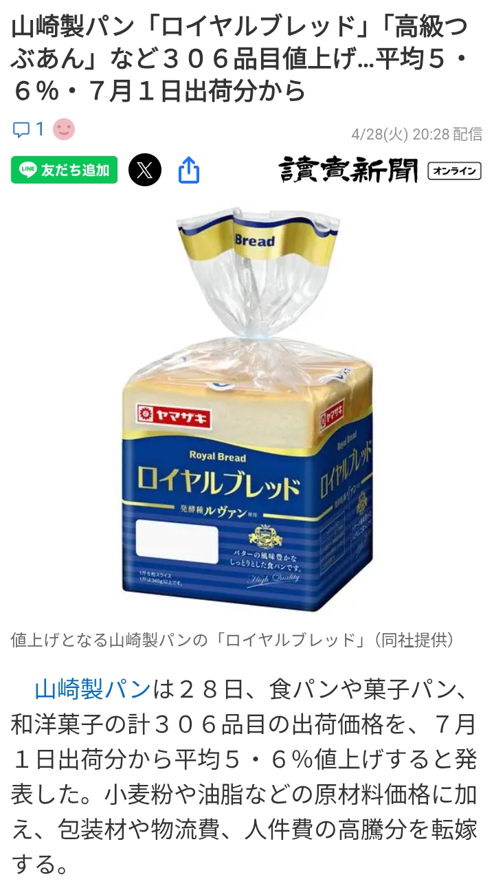 山崎製パン、306品を7月から値上げ削除された記事が4件あります.見る