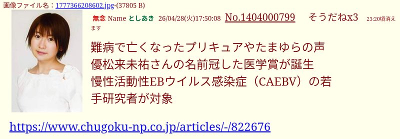 | … | 39無念Nameとしあき26/04/28(火)21:59:10No.1404069215そうだねx3>https://may.2chan.net/b/res/1404000799.htm |