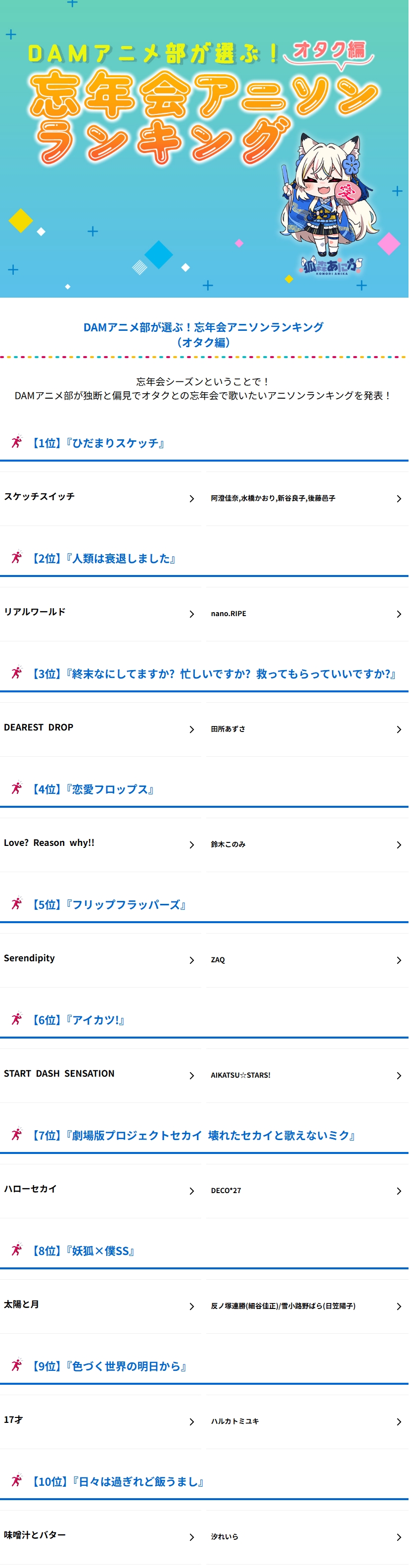 | … | 86無念Nameとしあき26/04/28(火)22:34:42No.1404079546そうだねx2ひだまり1位にケチを付けるのもアレだけどカラオケアニソンの頂点は今も昔も残酷な天使のテーゼでしょ |