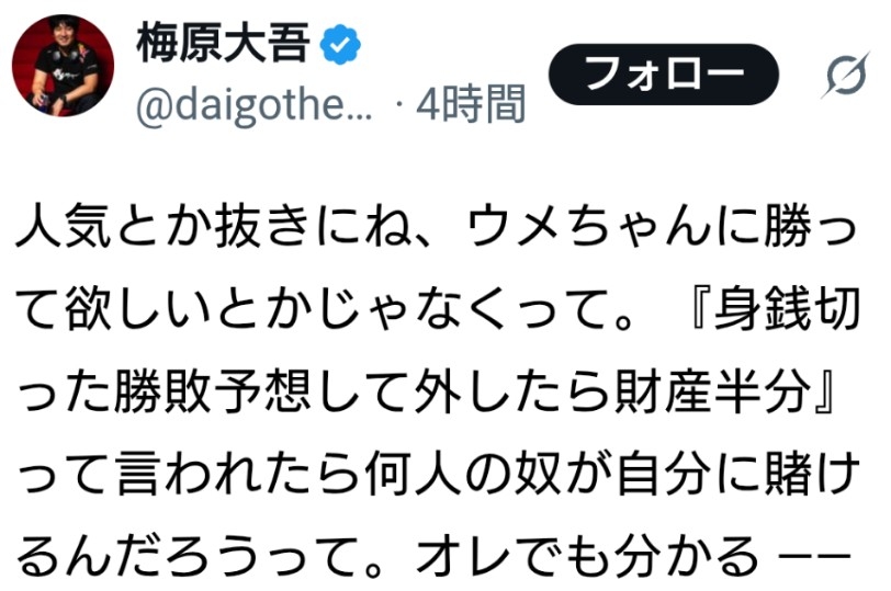 | … | 10無念Nameとしあき26/04/29(水)16:49:23No.1404229147そうだねx32,3本は取るかもしれないけど本気でウメが勝つと思ってる人はほぼいないんじゃないかな… |