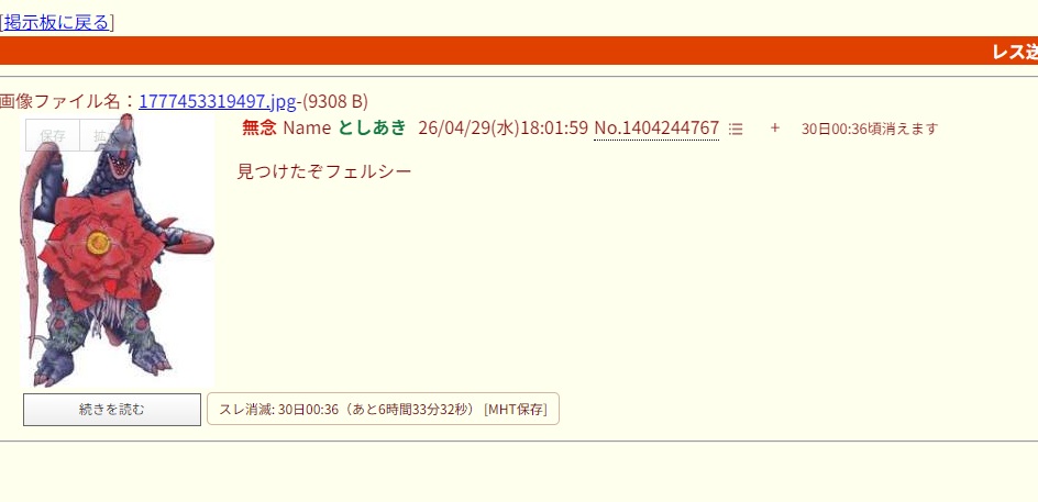 | … | 9無念Nameとしあき26/04/29(水)18:04:36No.1404245405そうだねx5 1777453476259.jpg-(68560 B) >見つけたぞフェルシー |