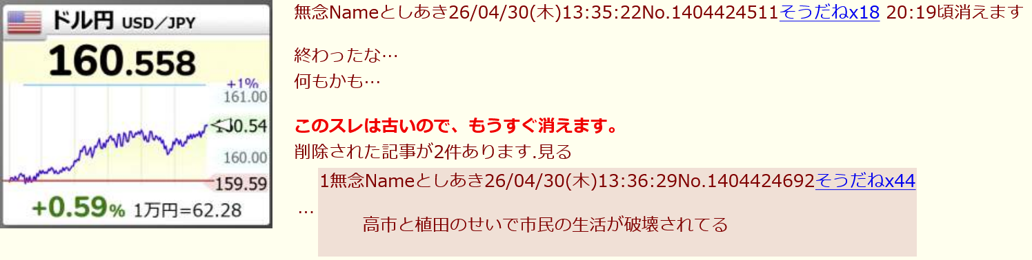 | … | 81無念Nameとしあき26/04/30(木)22:37:40No.1404549343+FXスレってなぜか円安で日本終わったさん来ないな |