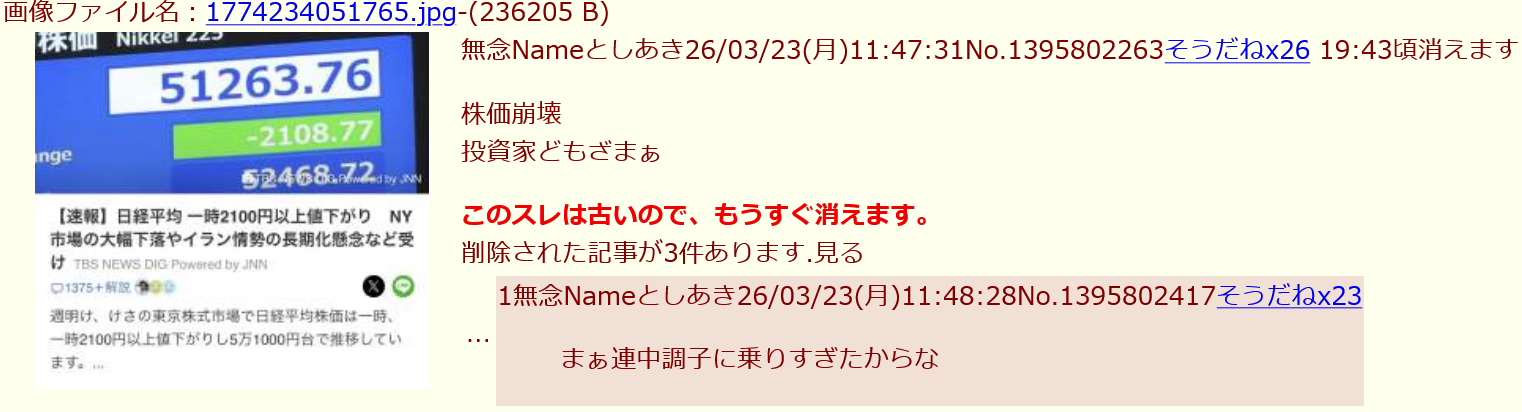 | … | 42無念Nameとしあき26/04/30(木)21:48:46No.1404536516+¥161で介入かと思ってたのに |