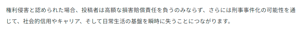 | … | 6無念Nameとしあき26/04/30(木)22:11:49No.1404542857+>当社が法的措置を講じた後、事態の重大さを初めて痛感する加害者も少なくありません。 |