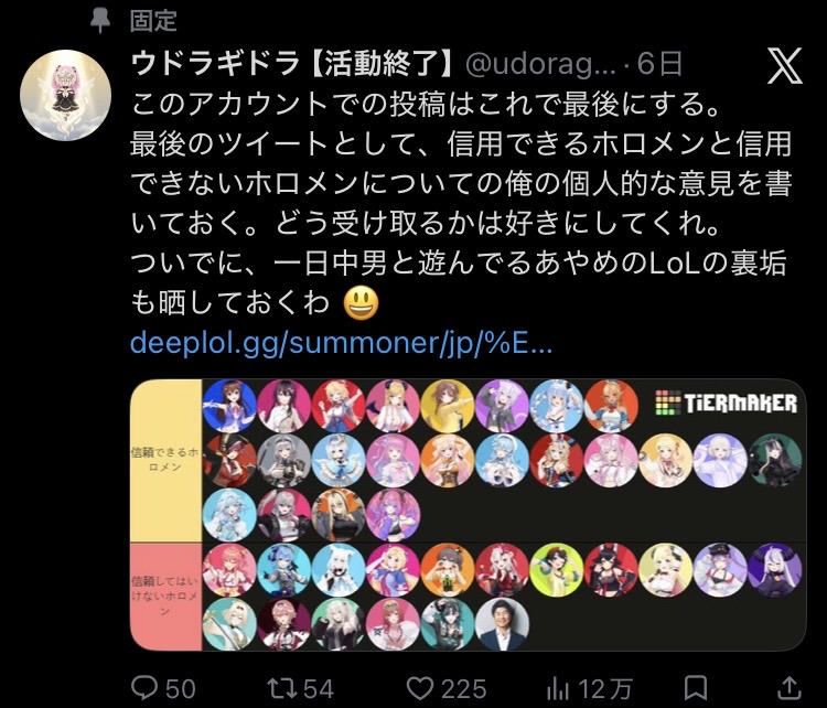| … | 45無念Nameとしあき26/04/30(木)22:40:09No.1404549940そうだねx30>ファン太解雇と無期限休止はにじのせい |