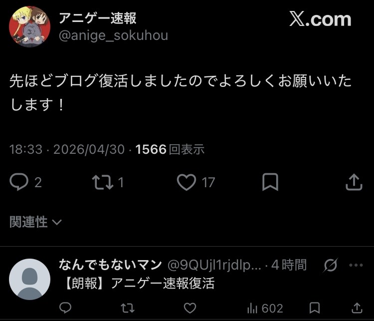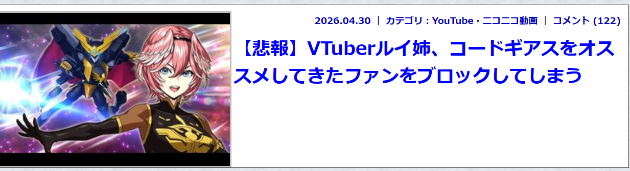 | … | 342無念Nameとしあき26/04/30(木)23:54:20No.1404565971そうだねx17>>アニゲーも死んだし他のまとめの最期も見れるかもしれねぇんだ |