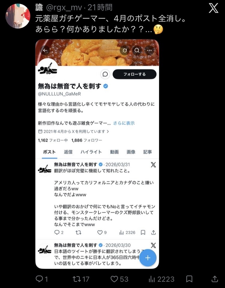 | … | 383無念Nameとしあき26/05/01(金)00:37:48No.1404573406+むしろポスト消したら証拠隠滅になるから悪手じゃなかったか? |