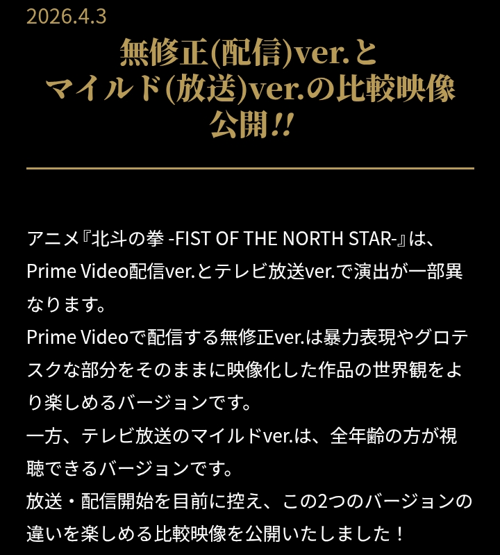 | … | 839無題Nameシャチ 26/04/12(日)19:46:58No.137673+ 1775990818996.png-(180062 B) >ひでぶう!やあべし!が旧アニメ並みかそれ以上にえぐい感じでしょうか?確かにそれだと昨今の地上波は無理ですね |