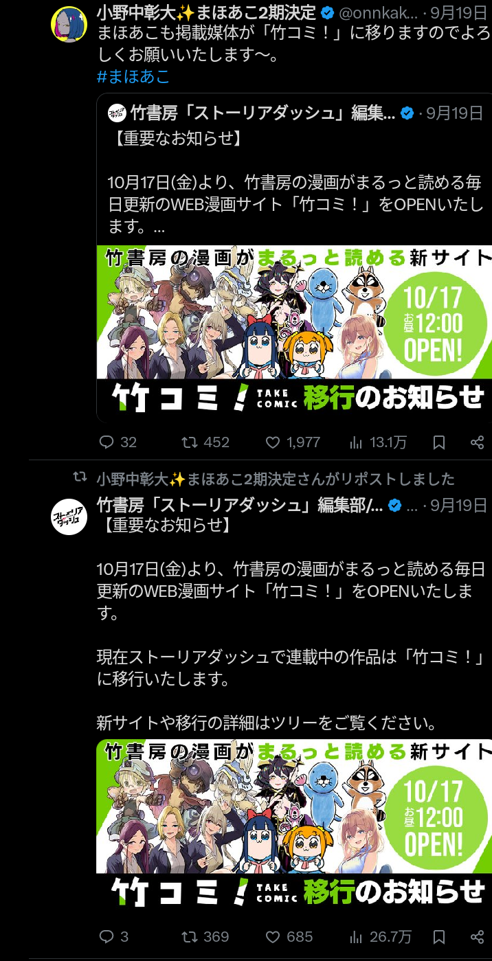 … | 554無題Name名無し 25/10/03(金)04:57:39No.136166+ 1759435059111.png-(794605 B) ![]() 原作マンガ掲載サイト変更のお知らせ |