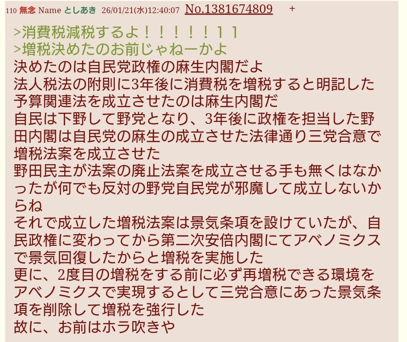 | … | 13無念Nameとしあき26/01/28(水)21:14:54No.1383343724+ 1769602494792.png-(671787 B) 増税を延期した理由は今でもよく分らない |