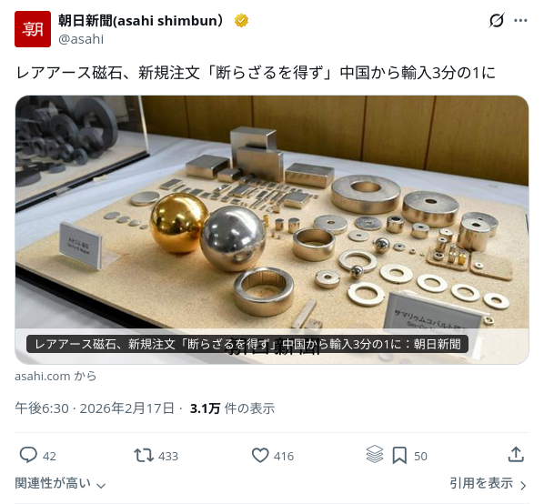 | … | 17無念Nameとしあき26/02/17(火)23:12:43No.1388153954+軍事用に使えんレアアースは売るとか言ってるな |