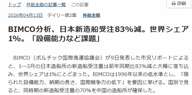 日本の新造船受注83%減、世界シェア1%レス23件省略。全て読むには返信ボタンを押してください。