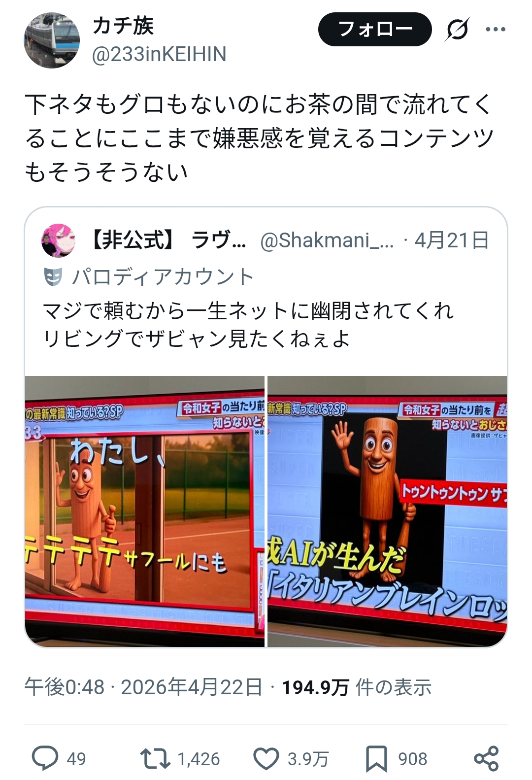 | … | 8無念Nameとしあき26/04/24(金)15:46:43No.1403057051そうだねx1 1777013203731.jpg-(91383 B) >コレが面白いと思ってるの? |
