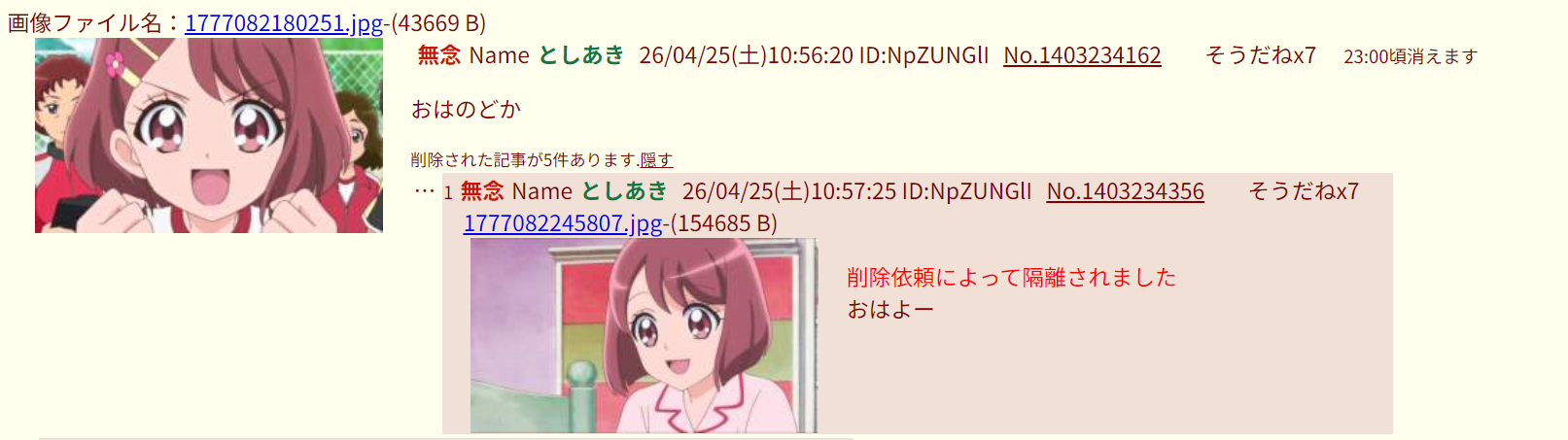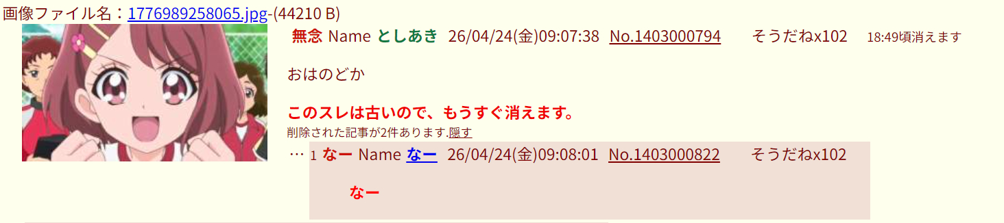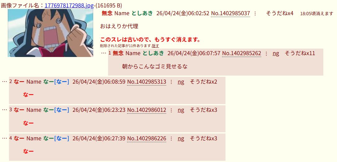 | … | 63無念Nameとしあき26/04/24(金)16:44:13No.1403064965+スレッドを立てた人によって削除されました |
