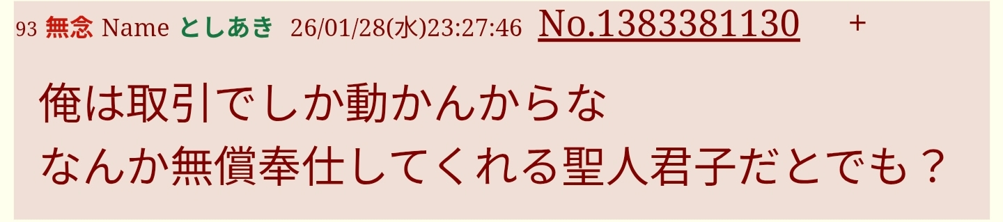 | … | 28無念Nameとしあき26/01/28(水)23:49:35No.1383385882そうだねx4もしかしたらsage爺が労働を始める可能性が微レ存…? |