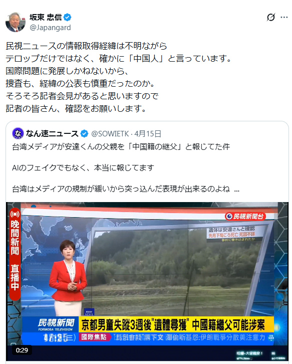 | … | 23無念Nameとしあき26/04/18(土)06:05:36No.1401620654+>現地の人が帰化した中国人って言ってるみたいだしそうなんじゃね? |