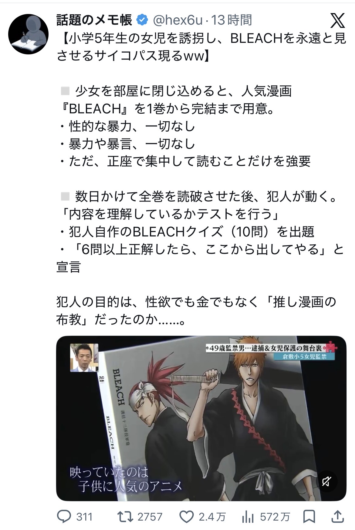 | … | 24無念Nameとしあき26/04/20(月)20:13:38No.1402280203+事件を思い出すとブリーチも連想して思い出す |