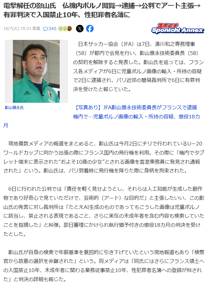 即決審理にかけられ執行猶予付きの懲役18カ月の判決を受けた。影山氏が自身の検索で年齢基準を意図的に引き下げていたという現地報道もあり「検察官から故意の選択を非難された」という。同メディアは「同氏にはさらにフランス領土への入国禁止10年、未成年者に関わる業務従事禁止10年、性犯罪者名簿への登録が科された」と判決の詳細も報じた。