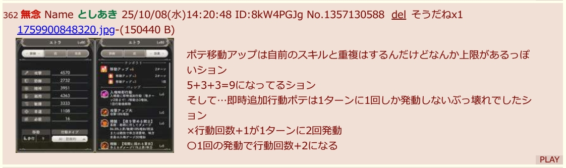 … | 7無念Nameとしあき25/10/08(水)18:37:43No.1357173526そうだねx2入魂後即行動はポテンシャルじゃなくて仕様変更でやってほしかったション |