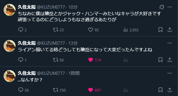 … | 32無念Nameとしあき25/10/09(木)00:23:49No.1357268159+先生の癖かつネームドだしマッスルだしライアンは最後の壁としてガッツリ描くだろうから楽しみだ |