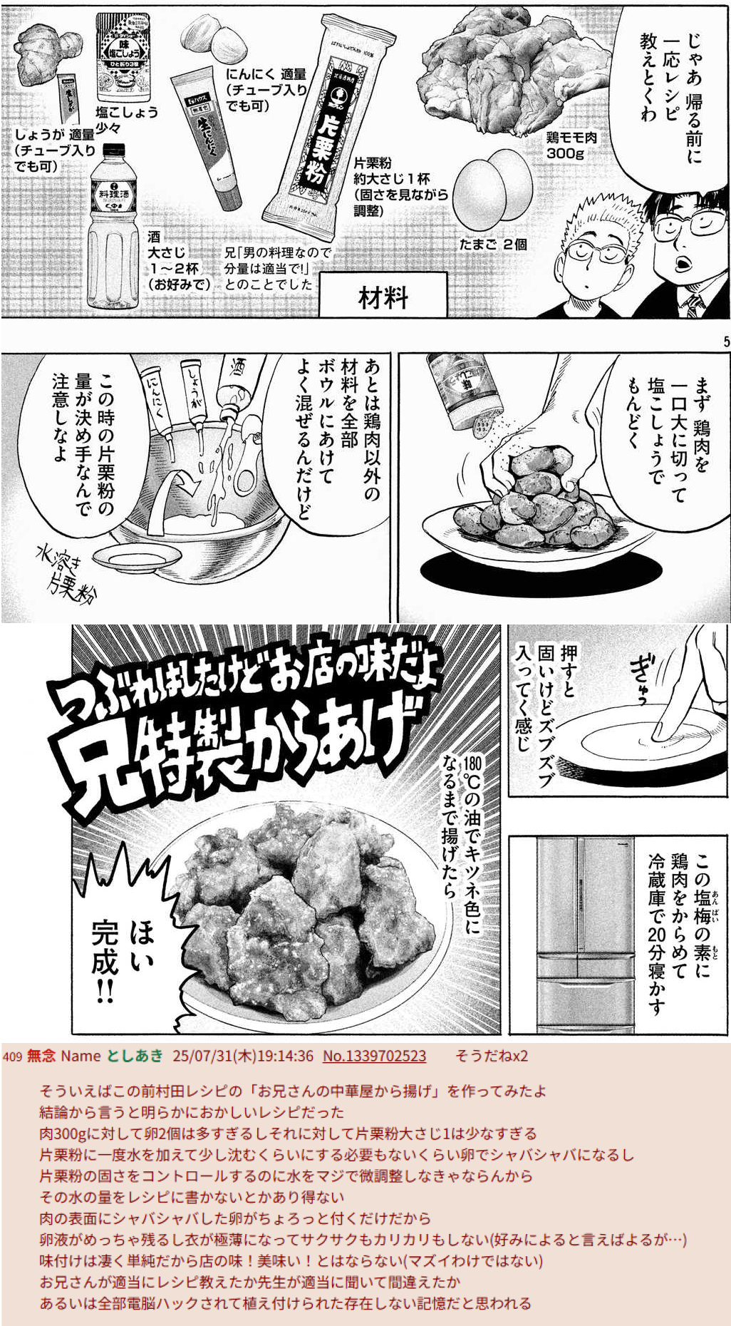 … | 729無念Nameとしあき25/10/10(金)14:43:38No.1357587893+ 1760075018906.png-(2256807 B) ![]() 味のほどは不明って言ってるってことは唐揚げは自分で作って検証済みってこと? |