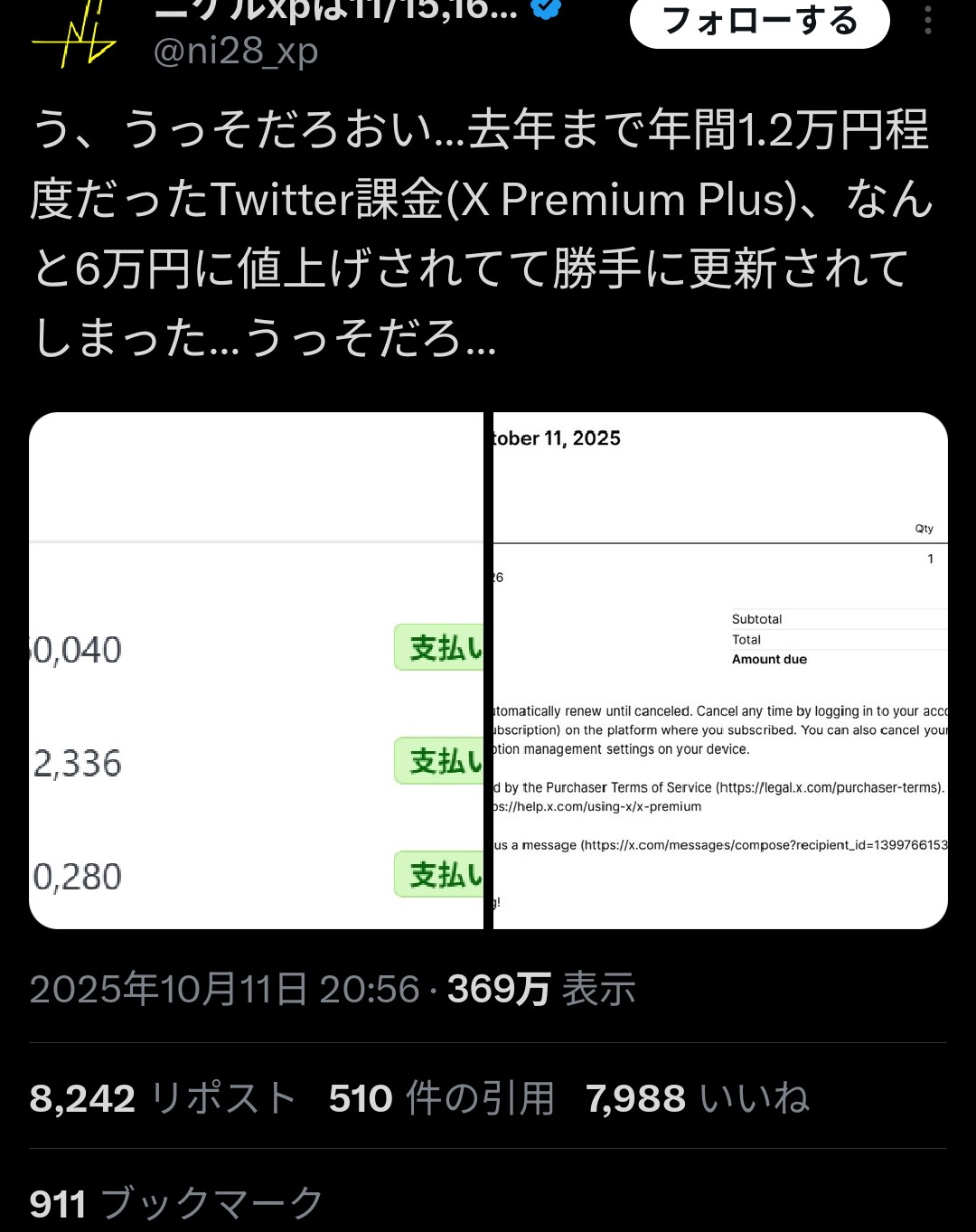 … | 15無念Nameとしあき25/10/13(月)07:53:50No.1358337896そうだねx1現状のXに課金するような人間ならこのくらいの扱いをしても金払うんじゃね? |