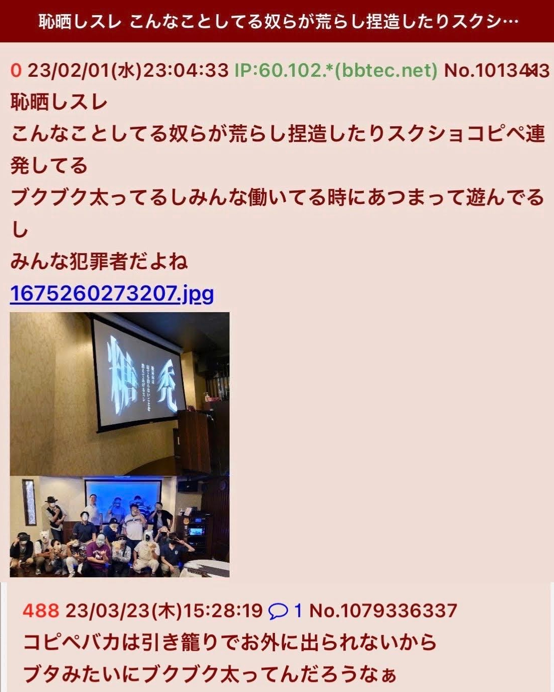… | 229無念Nameとしあき25/10/13(月)17:13:31No.1358452345+ 1760343211935.jpg-(644942 B) ![]() 荒らしって自分が逮捕されるのが怖くてお前らの方が警察に捕まるぞ!ってもう何度も見た |