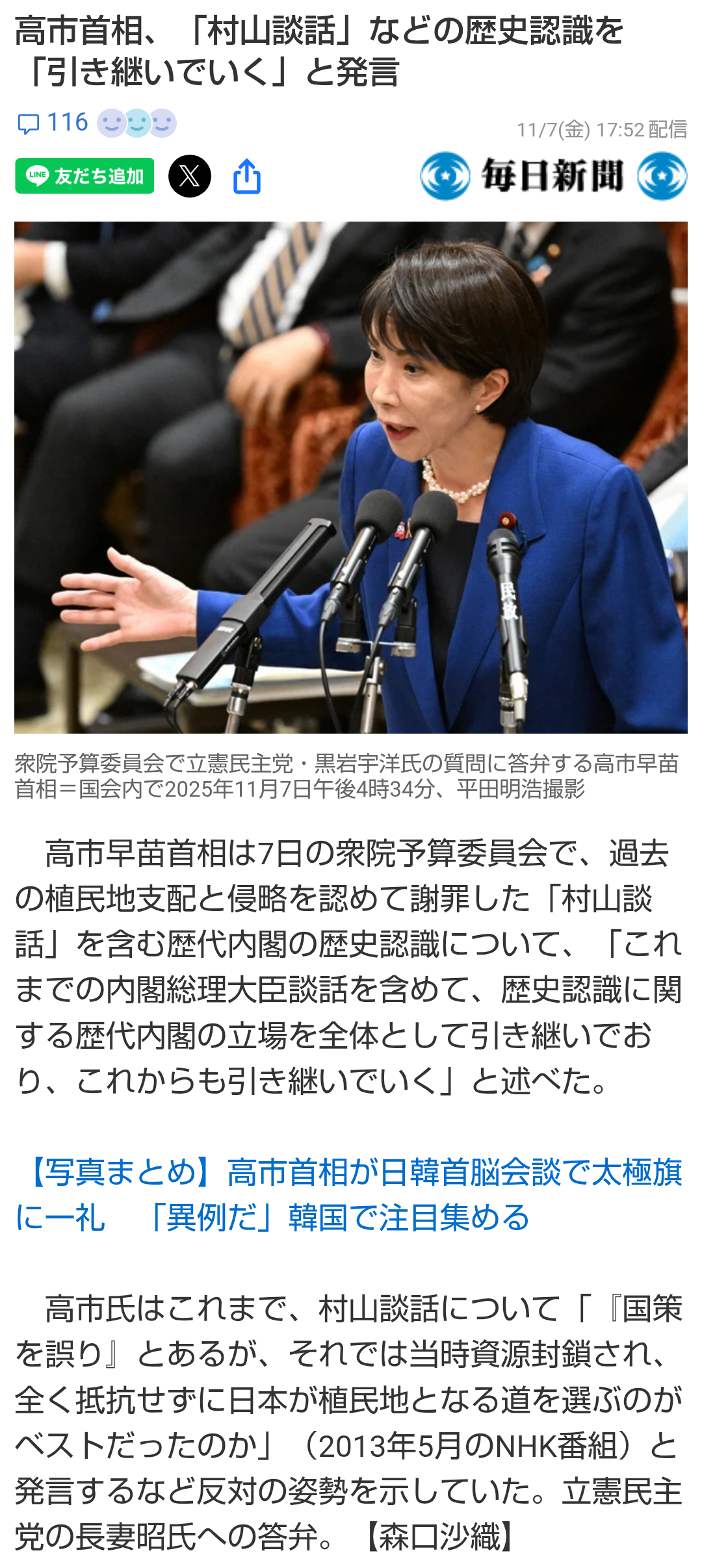 | … | 177無念Nameとしあき25/11/09(日)01:35:26No.1364792294+>村山談話は国策の誤りと言っていたのに日中首脳会談でキンペーに釘を差され村山談話を引き継ぐと言い始めた早苗さん流石です! |
