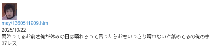 | … | 5無念Nameとしあき25/11/09(日)11:31:15No.1364857858そうだねx5ブチ殺すぞオラ!!(雨雲に向かって) |