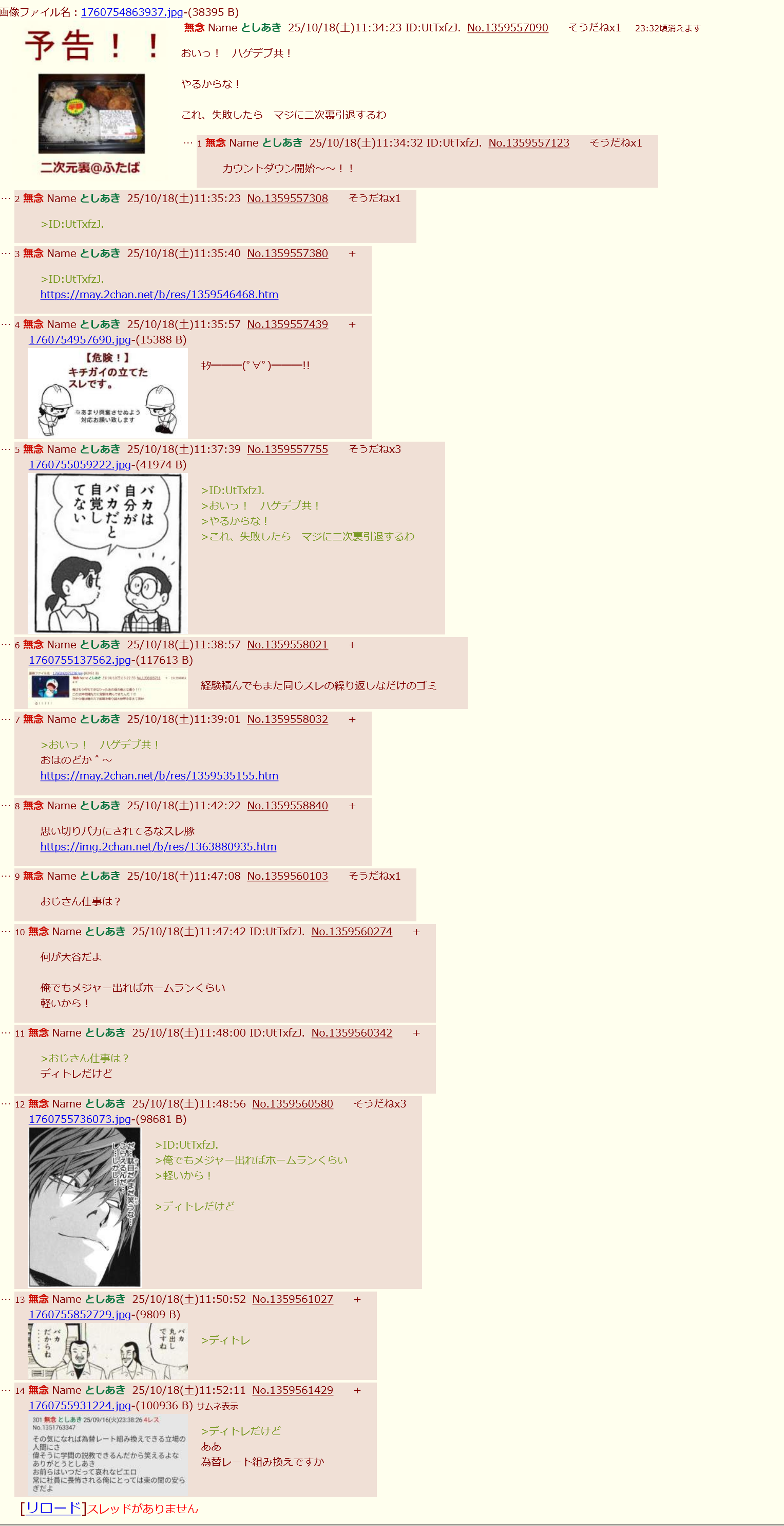 | … | 25無念Nameとしあき25/11/10(月)12:07:04No.1365121040そうだねx6>おらっ!!!!!ハゲデブ共!イオンで半額弁当買って来たからな! |