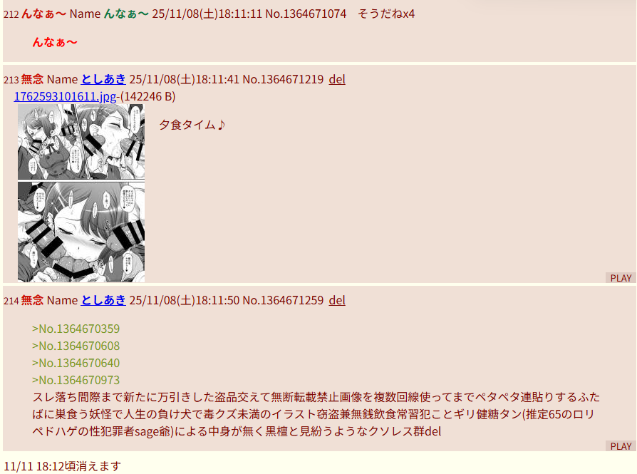 | … | 5無念Nameとしあき25/11/11(火)09:42:41No.1365319349そうだねx8 1762821761680.png-(206365 B) sage爺まーたのどかん画像(中途半端に)消してる^〜 |
