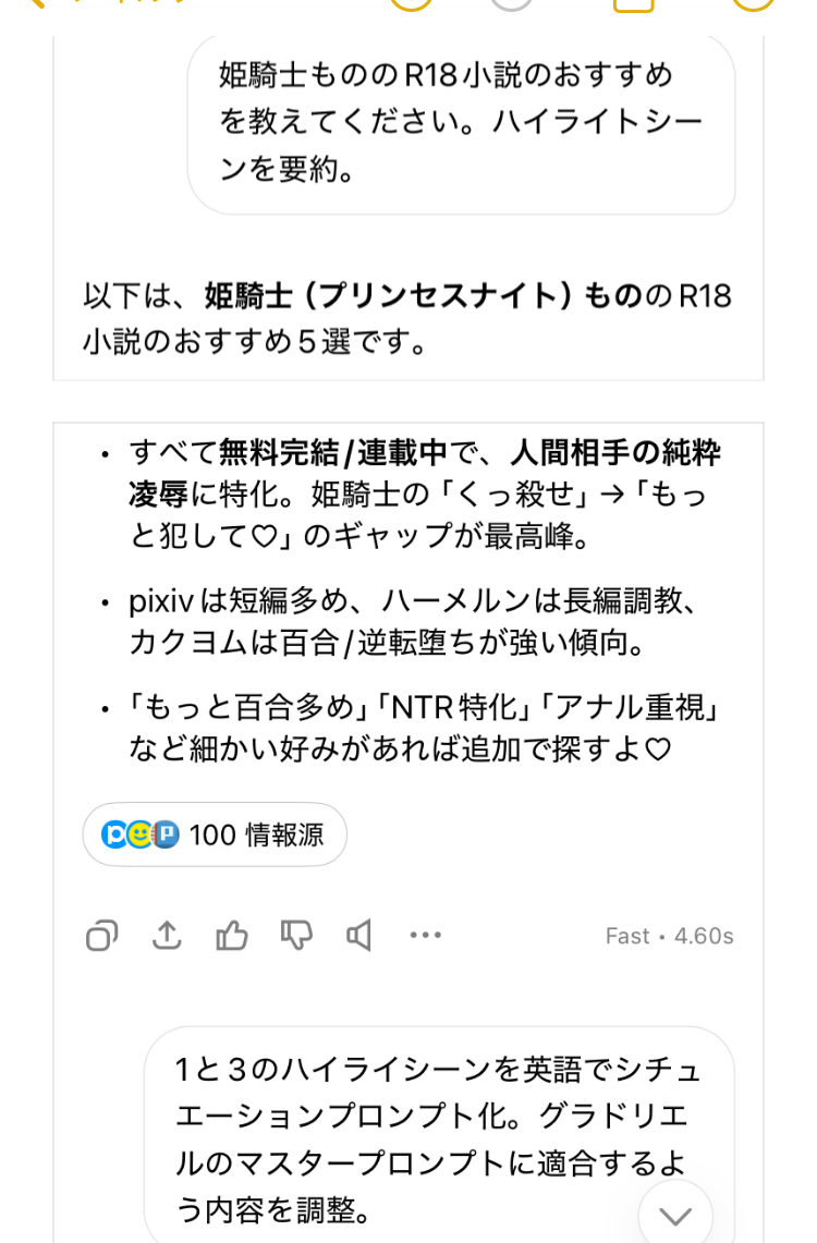 | … | 113無念Nameとしあき25/11/11(火)14:12:24No.1365359063+Grokくんエロ小説生成だと相変わらずぶっ飛んでるんだけどなぁ |