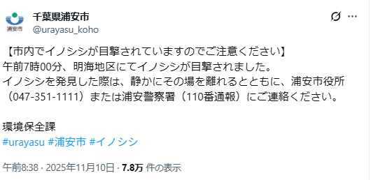 | … | 19無念Nameとしあき25/11/11(火)13:21:16No.1365351904+>>【東京・江戸川区でイノシシの目撃相次ぐ】4日朝 東葛西などで通報9件ほど 現在は行方分からず区は注意呼びかけ |