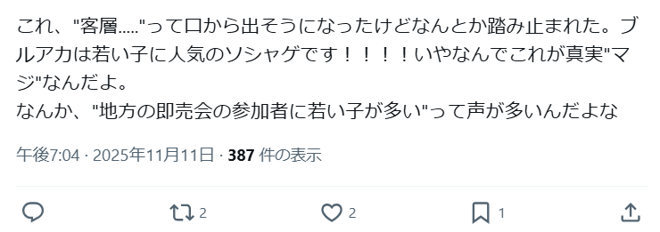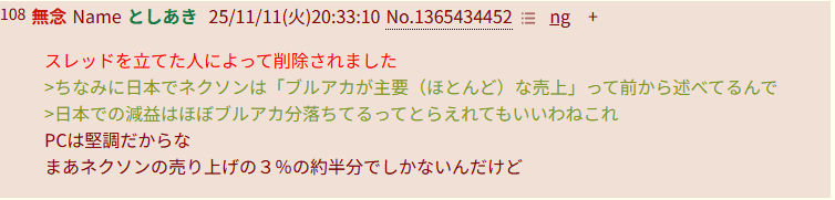 | … | 28無念Nameとしあき25/11/11(火)20:09:20No.1365427296そうだねx6 1762859360688.jpg-(22078 B) >イキってたらブルアカ名指し減収と次期も減収予測が飛んできた |