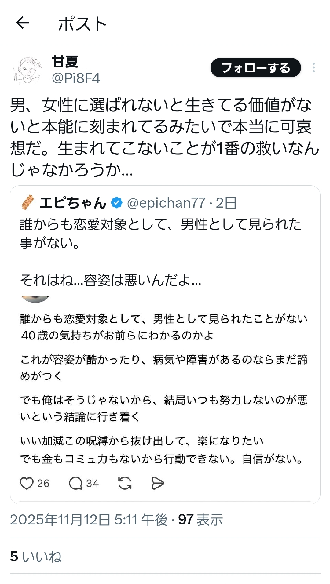 男、女性に選ばれないと生きてる価値がないと本能に刻まれてるみたいで本当に可哀想だ。生まれてこないことが1番の救いなんじゃなかろうか…